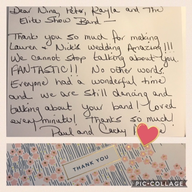 The Elite Show Band made our wedding! Nina, Peter and crew were fantastic and couldn’t of been more enthusiastic or professional. Would HIGHLY recommend them for your wedding or any large event. People that attended the wedding can’t stop talking about how great the band was and how much fun they had. Wish I could give them more stars… they are awesome!!